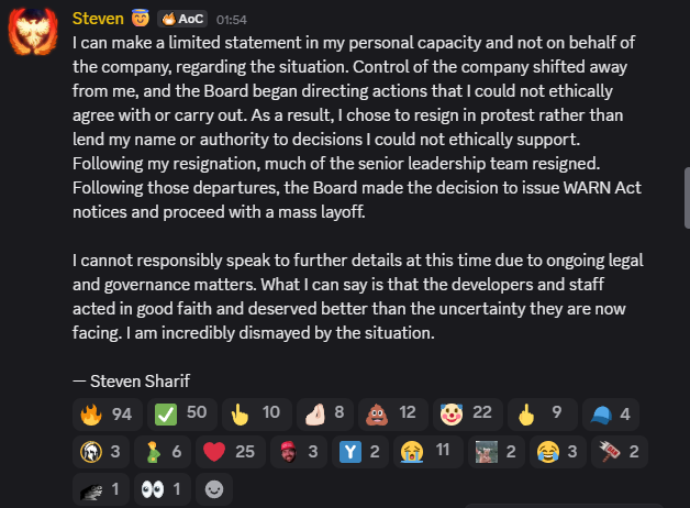 Следом основатель Intrepid Стивен Шариф (Steven Sharif) раскрыл больше деталей. Он пояснил, что ему пришлось покинуть свою должность в качестве протеста против действий совета директоров. Таким же образом поступили и другие топ-менеджеры студии, после чего в Intrepid начались массовые сокращения.